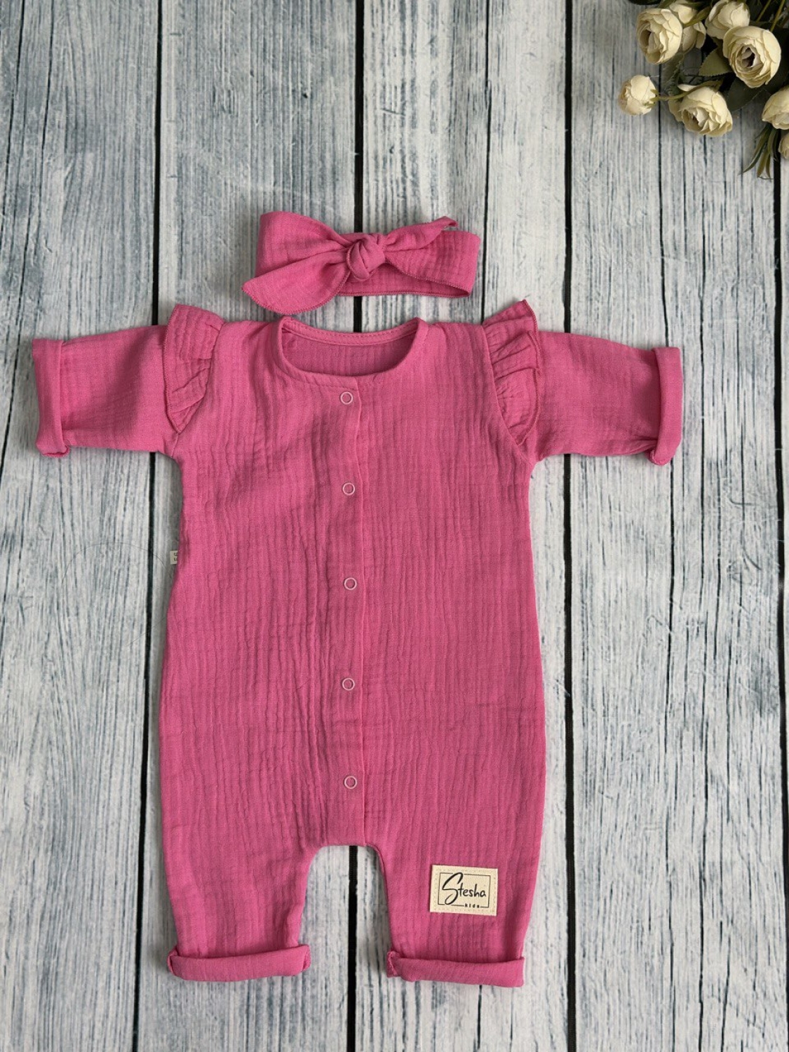 Теги: Купить оптом детский комбинезон . 336-Ф. Комбинезон с повязкой для девочки из муслина, хлопок 100%, размеры 56,62,68, фуксия цена,отзывы официальный сайт "Стеша Рубцовск"
